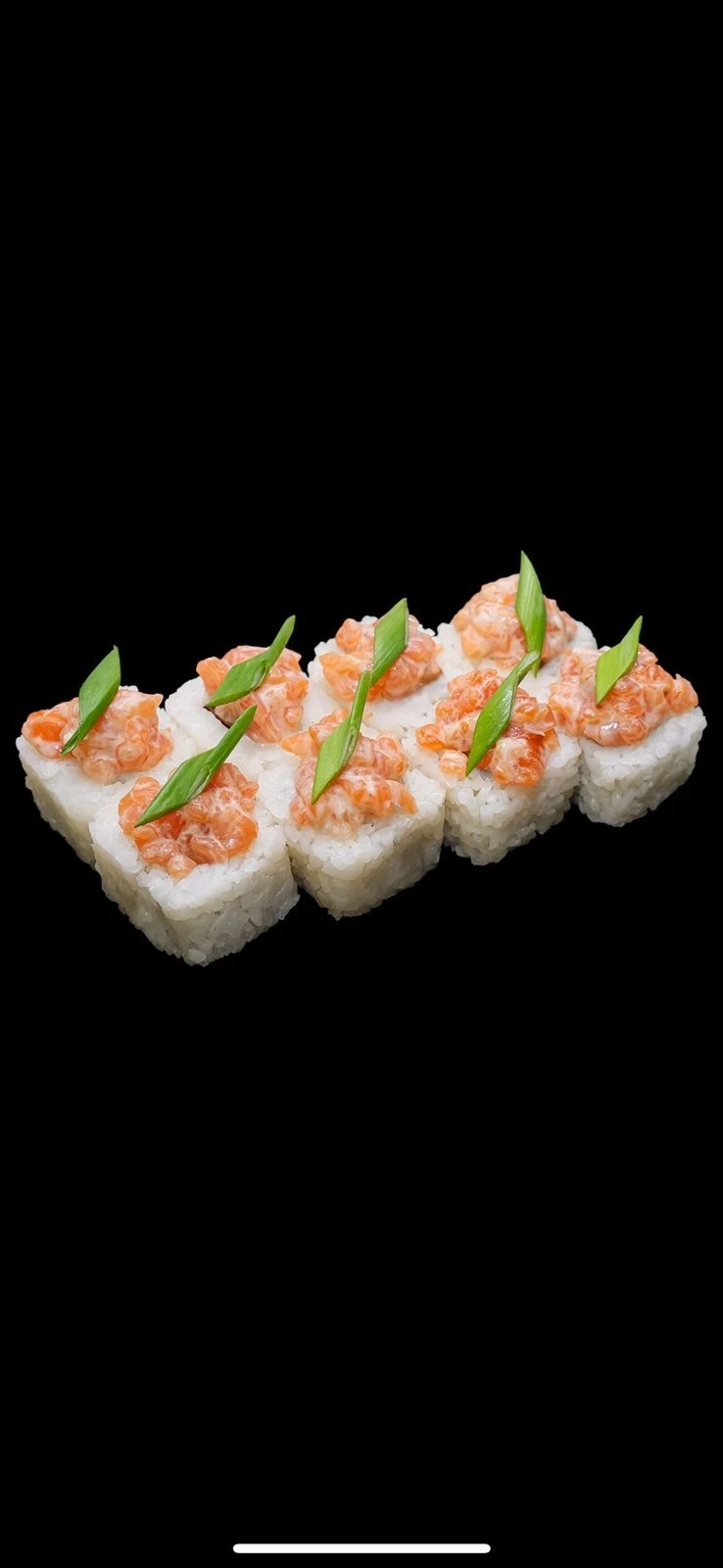 Рис, радужная форель, нори, томаты, соус ореховый, зелёный лук.